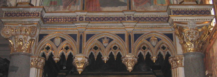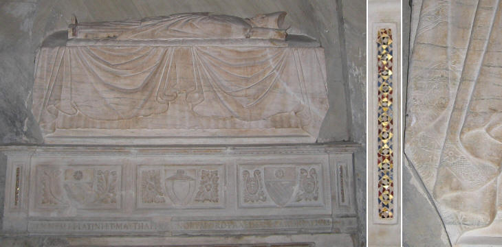S. Maria sopra Minerva: monumento al Cardinal Matteo Orsini It would be inappropriate to assume a rivalry between the Dominicans and the Franciscans, but for sure in the XIVth century there was a spirit of competition between these two monastic orders. Pope John XXII in 1323 proclaimed the sainthood of Thomas Aquinas, a Dominican monk whose works had an enormous influence on the theology of the Roman Catholic Church. In Rome the new church of S. Maria sopra Minerva was the Dominican response to the Franciscan church of S. Maria in Aracoeli. It was a very large church, the only one in Rome to have a distinct Gothic design. Knowing that the pope liked the Dominicans, who, unlike some Franciscans, did not criticize the pomp of the papal court, the Orsini chose to build their family chapel in this church (which was not yet completed). Today's visitors however do not find any longer an Orsini chapel in the church: this is now known as Cappella Aldobrandini, it has a lavish early Baroque marble decoration and it contains the monuments to the parents of Pope Clement VIII Aldobrandini (you may see it in a page covering the colours of Baroque Rome). The chapel was sold by the Orsini to the Aldobrandini in 1587 and the new landlords evicted the monument to Cardinal Matteo Orsini, the founder of the chapel. It was placed (without its Gothic baldachin) in a dark corridor leading to the church rear entrance (sic transit gloria mundi - thus passes the glory of the world).