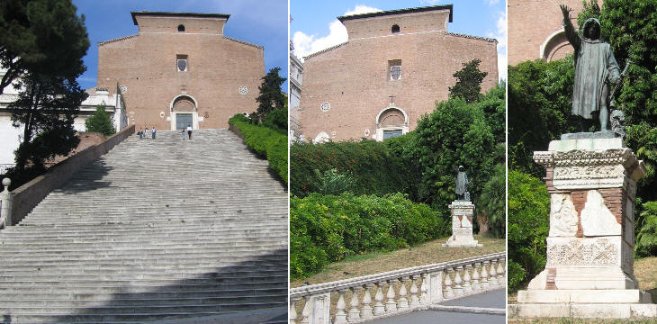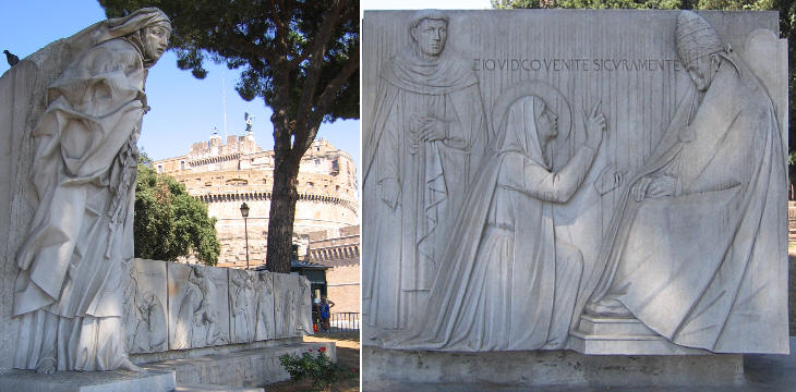 S. Maria in Aracoeli: steps and monument to Cola di Rienzo The Romans soon lost interest in the whereabouts of Cola di Rienzo because in 1348 a major pestilence spread throughout Europe. The Black Death, as this outbreak of bubonic plague became known, is estimated to have halved the population of Europe. In Rome the disease was accompanied by another calamity: a strong earthquake damaged several buildings including the Colosseo. The end of the plague was celebrated by providing S. Maria in Aracoeli with steps which allowed direct access to its main entrance: the church had initially had the entrance facing the Roman Forum, then the Franciscans rebuilt the church and reversed its orientation, but people continued to access the church from the Forum through a still existing side door. The new steps were a clear indication that the centre of Rome had moved from the Forum to Campo Marzio, the flat area between the hills and the river. Cola di Rienzo was eventually arrested and brought to Avignon. In 1353 however Pope Innocent VI thought the man could help him in restoring the papal authority in Rome and he was sent back with a small military force. He was initially greeted by the Romans, but the taxes he levied to maintain his troops and his personal greed soon made him unpopular. In addition, notwithstanding Cola's current role as papal envoy, the Colonna were less than enthusiastic about having him back in Rome. In September 1354 a hostile mob gathered at Palazzo Senatorio: Cola tried to speak, but he was soon interrupted and had to escape in disguise. He was identified from the gold bracelets he wore and killed without a trial. The body was left for two days outside the houses of the Colonna. Il ruolo di Cola come precursore della nazione Italiana e vittima del potere teocratico fu enfatizzato nel XIX secolo e il 20 Settembre 1887 (settimo anniversario dell'entrata delle truppe italiane a Roma attraverso la breccia vicino Porta Pia) fu inaugurato un monumneto a lui dedicato in un piccolo spiazzo tra le due scalinate al Campidoglio. He was portrayed in the act of haranguing the Romans: the statue was placed on a high base decorated with pieces of ancient lintels. Si invoca il Ritorno dei Papi Nel giugno del 1348 Papa Clemente VI comprò Avignone dal re di Napoli; questo atto, insieme con la costruzione di un grande palazzo indicavano che i papi francesi erano determinati a stabilire la loro residenza in maniera permanente in quella città. In un certo senso era una scelta forzata. Dopo la morte di Filippo il Bello, una serie di successori ressero la Francia per brevi periodi finché la corona passò a Filippo VI di Valois, che nel 1337 iniziò la Guerra dei Cento Anni dichiarando che Edoardo III, Re d'Inghilterra, aveva perduto i suoi diritti sull'Aquitania. Con la Francia indebolita dagli effetti della guerrai i papi si sentivano relativamente al sicuro ad Avignone mentre Roma e in generale le regioni italiane sotto l'autorità formale dei papi erano in preda all'anarchia. From a religious point of view however the decision to stay in Avignon was highly criticized. The great Italian poeti Dante e Petrarca ebbero aspre parole per la riluttanza papale a ritornare a Roma. Francesco Petrarca, che aveva avuto diretta esperienza della vita alla corte papale, descrisse Avignone come una nuoba Babilonia: