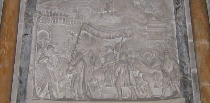 S. Francesca Romana: Monumento a Papa Gregorio XI: bassorilievo che ritrae il suo arrivo a Roma. Nel 1584 la municipalità di Roma costruì un monumento per celebrare Papa Gregorio XI e il suo ritorno a Roma; la decisione può essere interpretata come un omaggio indiretto al papa del tempo, un altro Gregorio (XIII). Il monumento fu progettato da Pietro Paolo Olivieri che in un grande bassorilievo ritrasse l'arrivo del papa a Porta S. Paolo dove he was greeted by a personification of Rome. Dietro il papa si può vedere una serie di cardinali. Durante il periodo che i papi trascorsero ad Avignone il ruolo ed il potere dei cardinali crebbe significativamente: they were in charge of the most important branches of the administration or they were sent as legate (governors) to the main towns of the papal state. The Curia divenne un corpo esteso, non molto differente dalla corte di un re di una delle grandi nazioni europee. Il suo mantenimento richiedeva ingenti risorse finanziarie; anche i cardinali avevano una corte personale e sfruttavano i loro uffici per trovare i mezzi per mantenerla. This large financial burden had a significant impact on the events which eventually led to the Reformation.