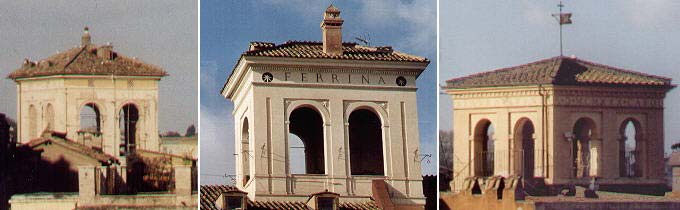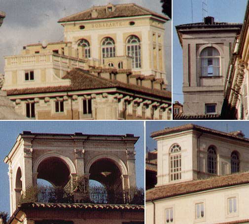 Aggiunte del XIX secoloNel XVII e nel XVIII secolo i progetti per nuovi edifici o aggiunte erano esaminati dall'Architetto della Camera Apostolica, ruolo di solito occupato da un architetto di solida reputazione, che spesso chiedeva di modificare i progetti per mantenere una certa coerenza nello sviluppo urbano della città. Nel XIX secolo, con la grande espansione seguita al 1870, il controllo fu limitato alle dimensioni degli edifici o delle aggiunte. Questo portò alla proliferazione di nuovi tipi di loggia. In un edificio in Via del Babbuino l'architetto aggiunse una loggia molto simile alla volta di una stazione ferroviaria (c'è anche un orologio). Palazzo Massimo di Rignano, di fronte alla scala che porta ai Palazzi del Campidoglio, ha un castelletto sul tetto, testimonianza della passione ottocentesca per il Medio Evo. |