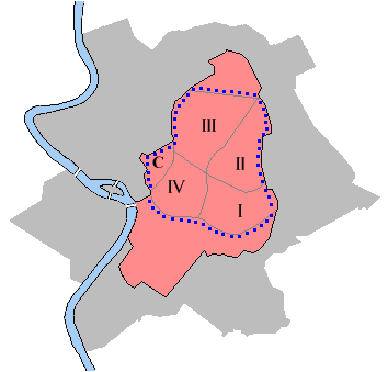 parte di città che circonda il nucleo storico venne divisa in quartieri, il