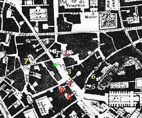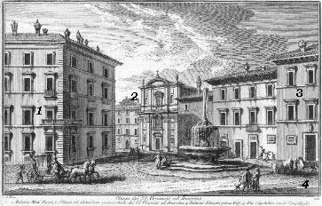 ![]() Siamo nelle strette stradine medievali attorno al Campidoglio. Una piazzetta in Via di Aracoeli ha tre elementi di una piazza Italiana: una chiesa, un palazzo e una fontana. La vista è presa dal punto segnato in verde nella piantina del 1748, sotto. Nella descrizione relativa alla tavola Vasi faceva riferimento a: 1) Palazzo Muti Bussi; 2) SS. Venanzio ed Ansovino; 3) Palazzo Silvestri; 4) Via Capitolina che mena al Campidoglio. La piantina riporta anche: 5) S. Rita da Cascia; 6) Casa di Pietro da Cortona; 7) Tor Margana; 8) Palazzo Fani; 9) Palazzo Massimo. ![]() ![]()