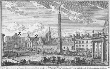 1) l'obelisco e la fontana; 2) S. Maria del Popolo; 3)