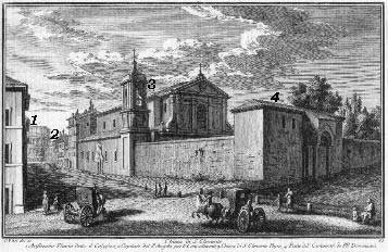 In questa pagina: Tavola di Giuseppe Vasi Com'è oggi S. Clemente Ospedale del Padre Angelo Casino Evangelisti La Tavola (No. 51) ![]() Un lato di S. Clemente è sulla strada aperta da Sisto V per collegare il Laterano con il Colosseo, del quale Vasi ci offre uno scorcio. La chiesa era stata da poco restaurata da Clemente XI (Carlo Stefano Fontana fu l'architetto incaricato dei restauri), ma aveva conservato l'antico portico. Nella prima metà del XVIII secolo molte vecchie chiese acquistarono una facciata barocca (S. Maria in Cosmedin, S. Maria in Trastevere, S. Giovanni in Laterano, S. Croce in Gerusalemme, S. Maria Maggiore). La vista è presa dal punto segnato in verde nella piantina del 1748, sotto. Nella descrizione relativa a questa pagina Vasi faceva riferimento a: 1) Anfiteatro Flavio (il Colosseo); 2) Ospedale del P. Angelo; 3) Chiesa di S. Clemente; 4) Monastero dei Padri Domenicani. La piantina riporta anche: 5) Casino Evangelisti. ![]() ![]()