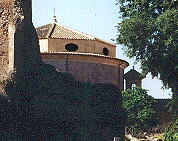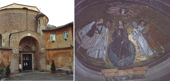 S. Teodoro è ancora visibile dal Foro. The low lying circular church was built in the VIth century and the much restored mosaic of the apse is of the same period. The church was largely rebuilt in the XVth century by Nicolò V, il cui stemma è ancora visibile on the walls at the entrance. Clemens XI restored the church in 1702 and Carlo Fontana designed the fine circular courtyard leading to the church. The heraldic symbols of the pope can be seen in the railing on the street level.