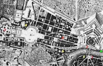 La vista è presa dal punto segnato in verde nella piantina del 1748, sotto.